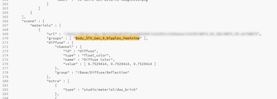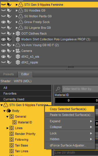 なので、Geo Grafting部分(乳首、へそ)のMaterialを保存したプリセットファイル(.duf)のソースコードを直接編集して、Bodyの部分をBody_STX_Gen_9_Nipples_Feminineに書き換えてやる必要がある。